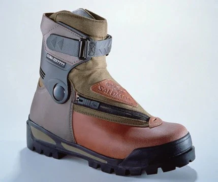 It is the first boot with rear entry and heel retention. Salomon commissioned the TGV designer, Roger Tallon, to design it. To manufacture it, the Annecy-based company mastered the process of plastic molding and multi-injection of technical components, as well as the use of special fabrics and composite materials. Initially launched in France and then worldwide in the following year: the famous orange boot is a dazzling success.ame to this toe piece developed by Georges Salomon, which combines a twisting motion with a forward motion. (Patent No. 1 130 484 of 7 May 1955). Two years later, the first binding - the Lift - replaces the traditional leather straps. This first safety binding is a success. The company recruits, expands, and develops new products.